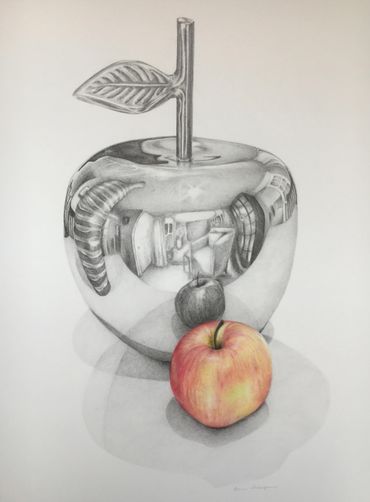 Drawing with pencil gives a softness to the work and the ability to achieve a high level of detail. The work takes many hours to complete applying layer upon layer of pencil, playing with the shadows, light and reflection, leaving the background white giving a crispness to the work.
